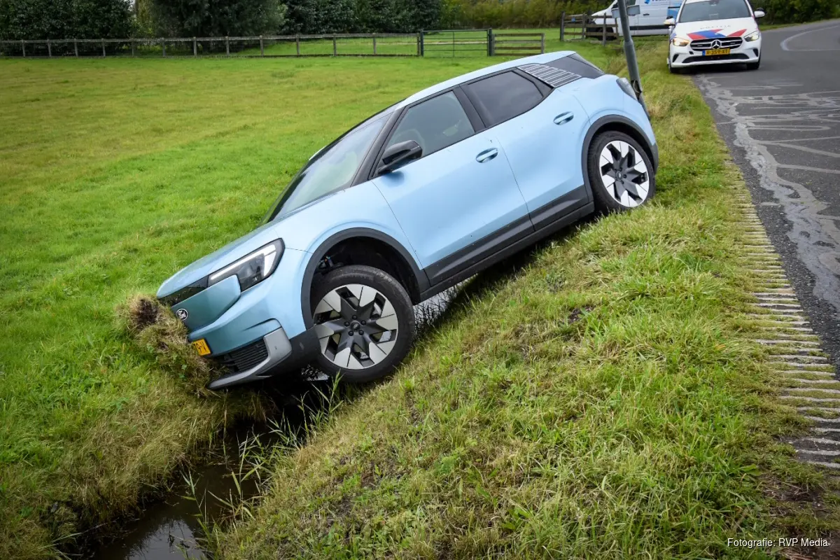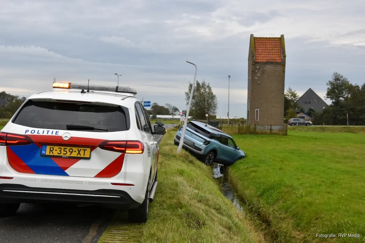 Een automobilist, rijdend in een vrij nieuwe auto, raakte even afgeleid, ramde een lantaarnpaal en belandde in een greppel, net boven een sloot. De bestuurder raakte niet gewond, maar de auto raakte wel beschadigd en is door een bergingsbedrijf afgevoerd.